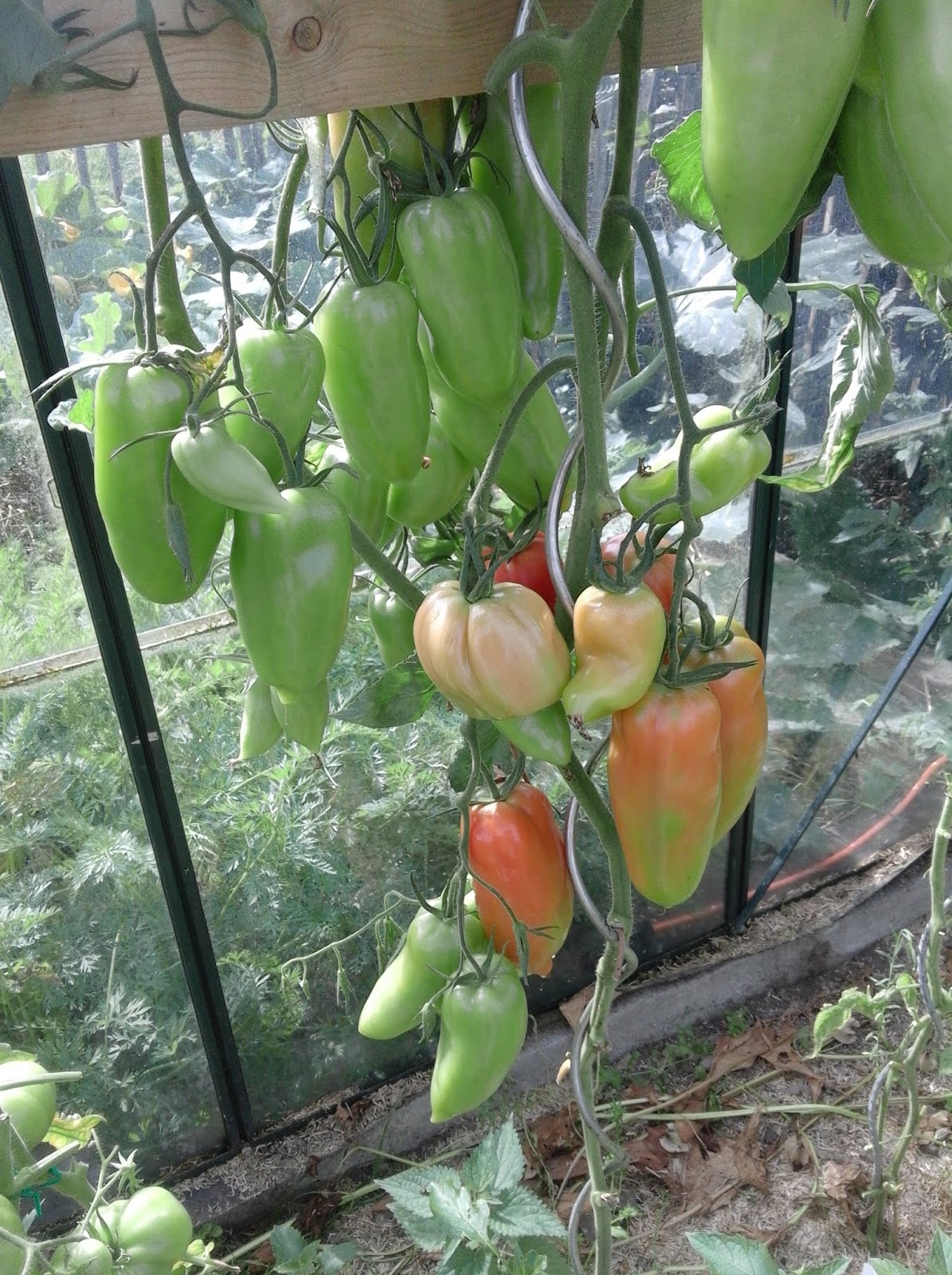 Mais parlons un peu des différentes variétés. Je n'ai acheté que une sorte : la classique ROMA. Toutes les autres sont des cadeaux d'amies (parfois je ne sais plus de qui : Désolée) lors d'un échange de graines ou de jeunes pousses.